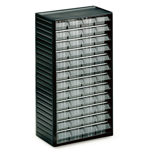 The small parts cupboard is 290 mm high and has an anthracite-grey polypropylene frame. The drawer shelves are of galvanised steel and take glass-clear polystyrene drawers with labels. There is full-depth support for the drawers from the cupboard frame. The small parts cupboard can be hung on the wall, can stand free or be combined with the table carousels.