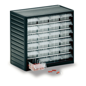 The small parts cupboard is 290 mm high and has an anthracite-grey polypropylene frame. The drawer shelves are of galvanised steel and take glass-clear polystyrene drawers with labels. There is full-depth support for the drawers from the cupboard frame. The small parts cupboard can be hung on the wall, can stand free or be combined with the table carousels.