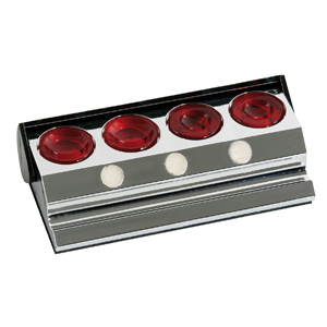 Oil block stand with four oil cups and three pithwood inserts, as well as a mobile black plastic protecting lid.