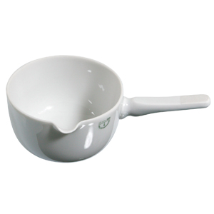 Boiling-out pan with handle and spout made of fireproof and acid-resistant porcelain.