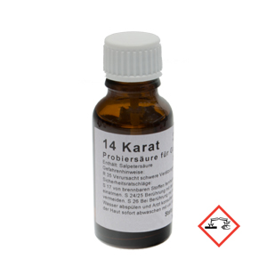 The gold test acid 585/- is applied to the touchstone by means of a bar test.