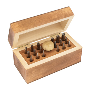 The setting closers are made of top-grade steel and has a conical hollow. It is for quick and even closure of stone settings and is supplied with a universal handle in a wooden case.