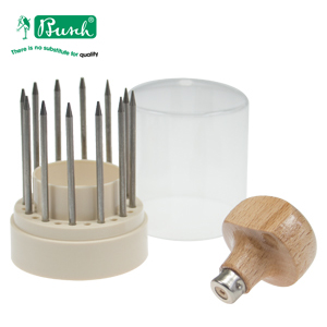 Assortment of 12 BUSCH beading tools from No. 2 to 16, including wooden handle and a clear storage box. Beading tools made of hardened steel with polished grains of the best quality. Made in Germany.
