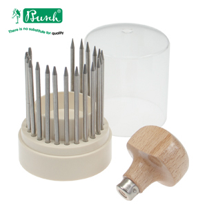 Assortment of 19 BUSCH beading tools from No. 1 to 19, including wooden handle and a clear storage box. Beading tools made of hardened steel with polished grains of the best quality. Made in Germany.