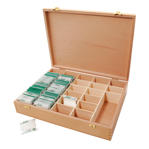 Practical wooden selection box with fixed compartments in colourless, lacquered finish. Ideal for storing and organising pearl silks, seals, glasses, as well as reference and calibre spare parts. Without content.