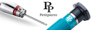 High-quality precision screwdriver from Petitpierre with practical adapter system for quick exchange of the different blade widths. The different coloured rings on the adapters ensure that the required blade width can be selected quickly.