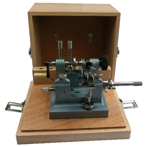 Small pivot polisher and burnishing machine for pivots from 0.04 – 1.20 mm. Tilting polishing disc, usable for conical and cylindrical pivots, which makes setting fast and simple. The polishing discs are of hard metal. Complete with three broaches, in a wooden case.