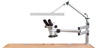 The "Flexbo" Light Package consists of one basic column, a LED work lamp and a binocular microscope unit with swivel arm, Adapter lens and LED ring light. This package can be installed as a stand-alone-Version without tool shelf. The LED work lamp is supplied by a mounting flange and the microscope unit by a swiveling arm and accessories.