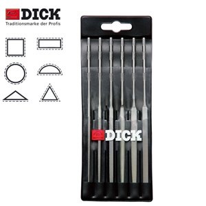 Needle file assortment from DICK in 6 different shapes. DICK needle files are particularly recommended for steel and steel alloys, non-lubricating soft metals and fine finishing work. The thin, pointed files have a round handle and sharp edges and points.