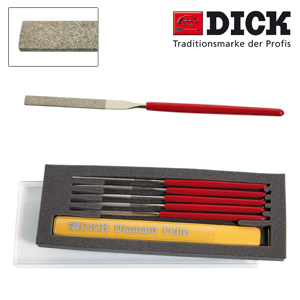 Diamond needle files assortment from DICK in practical storage box. Ideal special files for machining hardened steels, hard metal, ceramics, procelain and glass. A low contact pressure is sufficient to work quickly and accurately with these files.