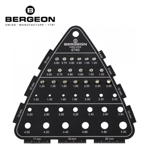 The robust universal measuring tool made of metal combines the measurement of crowns, tubes, winding stems and tap sizes in one. Bergeon Swiss-Made quality tool.