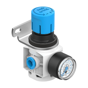 Pressure reducer with regulator and manometer in miniature format. This pressure regulator serves as a pressure damper in front of vacuum handpieces and blow-out guns. It is mounted just before the unit to prevent damage to the vacuum or blow-out handpiece.