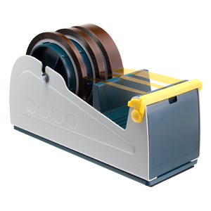 Practical dispenser with powder-coated steel housing and non-slip adhesive pad, fitting for Kapton masking tapes with spool-Ø of 76 mm. Pickup of 3 rolls with a width of 4-25 mm. Easy cutting of the tapes by a fine cutting blade. Three guide rollers ensure optimum unwindng of the tapes.