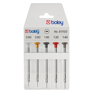Precision screwdrivers made of Swiss quality in stainless steel with ball-bearing rotary head. Assortment of 5 screwdrivers in plastic etui. Swiss-Made.