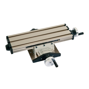 Cross table made of high-strength aluminium with backlash-free adjustable dovetail guides suitable for Xenox TBX bench drill. Three continuous T-slots (12 x 6 x 5 mm). Movable ruler for positioning the cross slide. Handwheels with scale ring adjustable to "0" (1 U = 1.0 mm, 1 graduation mark = 0.05 mm feed). Incl. clamping claws as shown and fixing screws for bench drill TBX.