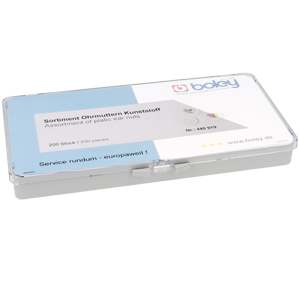 Assortment of 200 ear nuts with yellow and white metal core or without metal core. Including practical tweezers to pull the ear nuts. As well as clearer Assortment.