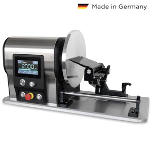 The speed of 0-3000 rpm can be set classically via a rotary knob or via the large touch screen. Desired speeds and work steps can be stored in the memory so that they can be exactly repeated later 1:1. The set speed is shown in the large and clear display. An emergency stop switch ensures optimum safety. Made in Germany!
