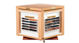 Free-standing, theft-proof sales display in high-quality wood panelling, consisting of three modular components: a basic element with turntable, a top element and a base cabinet.