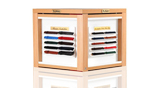 Free-standing, theft-proof sales display in high-quality wood panelling, consisting of three modular components: a basic element with turntable, a top element and a base cabinet.