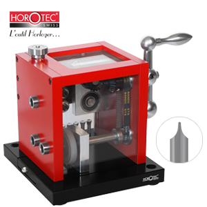 Device for professional and exact regrinding or making of screwdriver blades with trumpet-shape “T-shape”, to prevent damage to high quality watches with blued or gold screws. Thanks to the two adjustable cylindrical grinding wheels made of CBN, reworking even hardened blades is no longer a problem. Swiss Made.