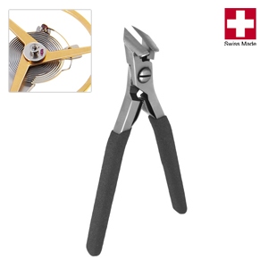 Small handy side oblique cutter with angled and full-flush cutting edge, ideal for cutting hairsprings and soft metals. The narrow and compact design is ideal for working in confined spaces. Stainless and corrosion resistant, shafts with PVC plastic coating and double blade spring. Swiss-Made.