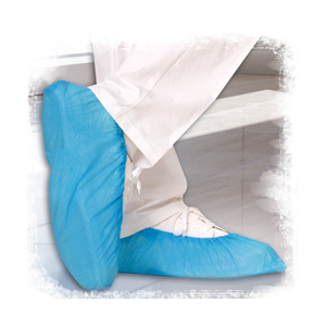 Sturdy, impermeable to liquids material one way overshoes, made of polypropylene.
