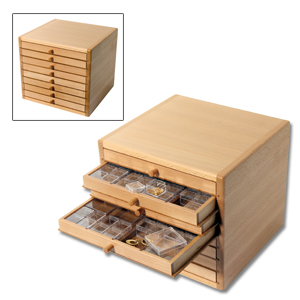 Storage and presentation cabinet made of solid beech wood, with eight drawers suitable for jewellery and clocks. Each drawer is divided into four sections.