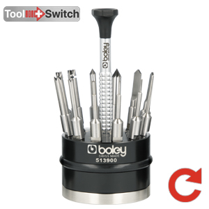 Practical assortment on ball bearing rotary base with ToolSwitch-attachment for quick change of inserts. The cutters and countersinks are made of hardened steel (63HRC - 65HRC). Swiss-Made.
