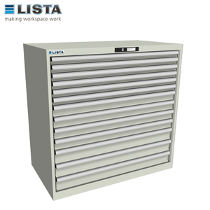 Thanks to the stable construction from high-quality sheet steel with different drawer heights, the housing can bear a total load of up to 4000 kg. All Lista products can be installed flexibly, on their own next to a workstation or combined with a workbench, stacked or as a mobile cabinet on castors.