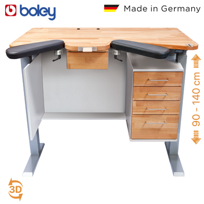 The new FLEXBO-workbenches 3.0 are of outstanding workmanship and functionality. The 3D armrests are freely moveable and finished with black imitation leather. Watchmakers workbench with one stacks with four drawers including armrests and electrical height adjustment.