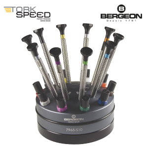 Assortment of 10x Bergeon screwdrivers made of stainless steel with a new special knurled profil on a ball bearing revolving base. The special profile allows you to fit different tension or torque drums. The screwdriver can be used without drums, with the new knurled profile, you have a optimum hold. All blades are made of hardened stainless steel