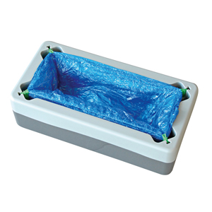 Practical overshoe dispenser for easy and quick putting on of the overshoes. For employees or visitors who visit or work in clean rooms.