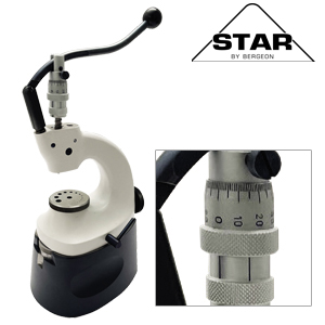 STAR precision staking and jewelling tool made in Switzerland, including height adjustable micrometer-base, as well as extensive equipment for riveting and jewelling. The second micrometer is used to adjust the height of the wheels.