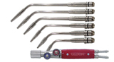 micro-soldering GloorFor brazing, annealing or melting with a flame temperature of up to 2400 ° C. Subgroups hand piece nameVersionmanufactureitem No.Handpiecepropane / oxygenGloor510441 Handpiece Complete nameVersionmanufactureadditionitem No.Handpiece setpropane / oxygenGloorincl. 6 weldingheads510454 Micro nameVersionmanufactureitem No.micro soldering headfor micro solderingGloor510443 heating head nameVersionmanufactureitem No.heating headfor smeltingGloor510442 propan regulator nameVersionadditionmeasuring rangeconnectionitem No.pressure regulatorpropanewith manometer0-6 bars3/8" L510446gasketPolyamidefor pressure reducer695513 oxygen regultor nameVersionadditionmeasuring rangeitem No.pressure regulatoroxygenewith manometer0-10 bar510449gasketPolyamidefor pressure reducer695513 flame blow-back safety fittings nameconnectionVersioncolouritem No.flame blow-back3/8" Lfuel gasred510466flame blow-back1/4" RoxygeneBlue510468 pressure pipes nameVersionInside-Øoutside-Øitem No.pressure hosepropane4mm12mm510460pressure hoseoxygene4mm12mm510462 Hose connectings nameVersionconnectionInside-Øitem No.Hose connectingpropane3/8" L4mm510419Hose connectingoxygene1/4" R4mm510427 Hose fixing nameoutside-Øitem No.pipe clamps6 - 9 mm510420 Gas distributor nameVersionconnectionInside-Øitem No.Gas distributorpropane3/8" L4mm510475Gas distributoroxygene1/4" R4mm510474 gas economisers nameVersionmanufactureitem No.gas economisersPropane/Natural gasGloor510444 torch holder namemanufactureVersionitem No.torch holderGloorwith swan neck510448 melting package nameaccessoriesdescriptionitem No.melting packagesetfor melting604190