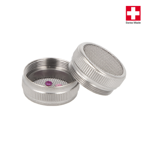 Practical sieve capsule with screwed lid for cleaning small parts in the cleaning machine.