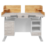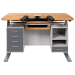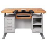 As the focal Point of your Workshop, these tables are characterized by a robust, about 4 cm thick solid beech table top, which is largely resistant to liquids and acids. Stable, electric height adjustable steel support legs and smooth-running drawers with attractive bar handles contribute to a robust, modern overall concept.