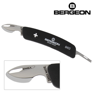 High-quality watchmaker's knife with two fold-out tools made of stainless steel and safety button for unintentional closing of the blade. By pressing the push button the knife blade can be folded back. The non-slip surface serves for a safe and optimal holding. The 2-in-1 tool is the ideal companion for on the go. The knife blade is used for easy opening of pressed case backs, the spring bar tool for changing straps or bracelets. The knife blade and the spring bar tool are made of hardened stainless steel (450/57 HRC). Swiss-Made by SWIZA.