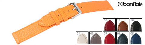 Calfskin grained satin finish, flat version with stitching. In bright colours